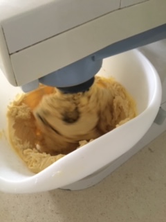 Make sure the butter is at room temperature and add the dry ingredients gradually, otherwise a floury mixture will fly all over your kitchen. Beat until the mixture has the consistency of peanut butter. It is a rather stiff mixture. Don’t be alarmed.