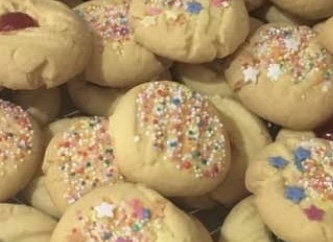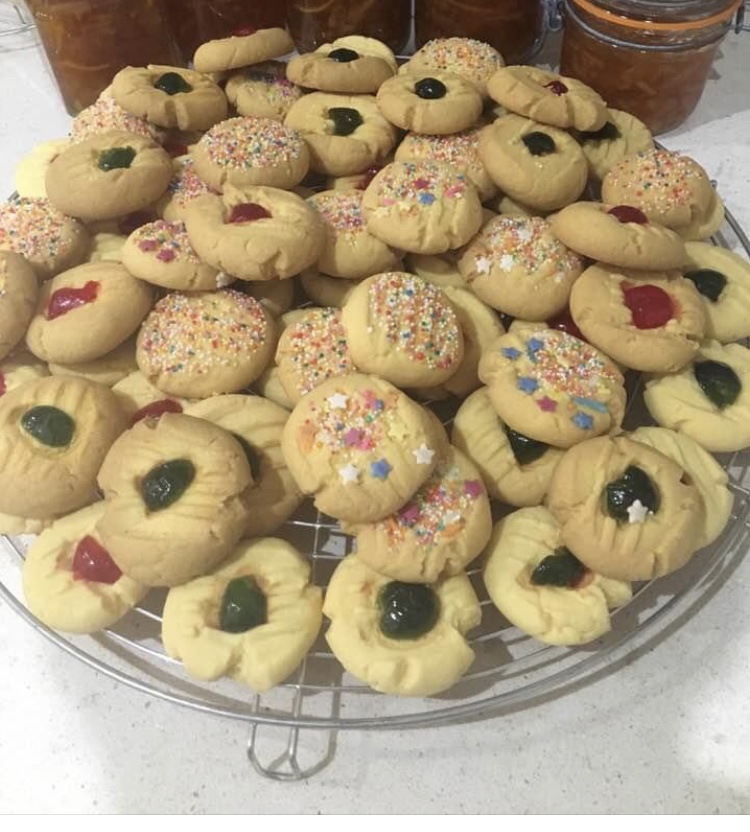 Decorate with cherries, hundreds and thousands etc and bake at approximately 180C for about 12 minutes or until the edges are just turning golden. It’s not an exact science. This is a very forgiving recipe. Take the trays out of the oven and let the biscuits cool a little before transferring them on an egg lifter to a wire cooling rack. This should give you a perfect batch of Elma Berry’s Biscuits.