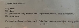 Elma Berry’s biscuits are quite famous although they have several aliases. To me they are ‘Auntie Elma’s biscuits’, to Glynis, a close friend of mine, they are ‘Evelyn’s Biscuits’ (Evelyn was my mother), and to Gill, another friend, they are ‘Ilva’s biscuits.’ Gill’s mother, Rosemary, got the biscuit recipe from Glynis’s mother, Ilva, so somewhere out there I imagine there is someone who calls them ‘Rosemary’s biscuits.’