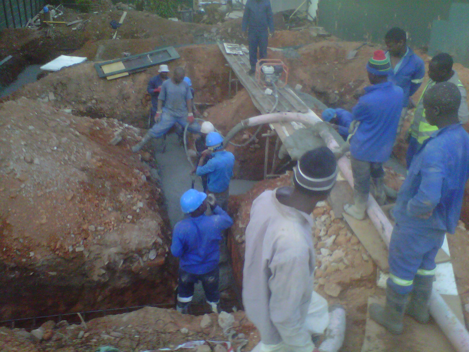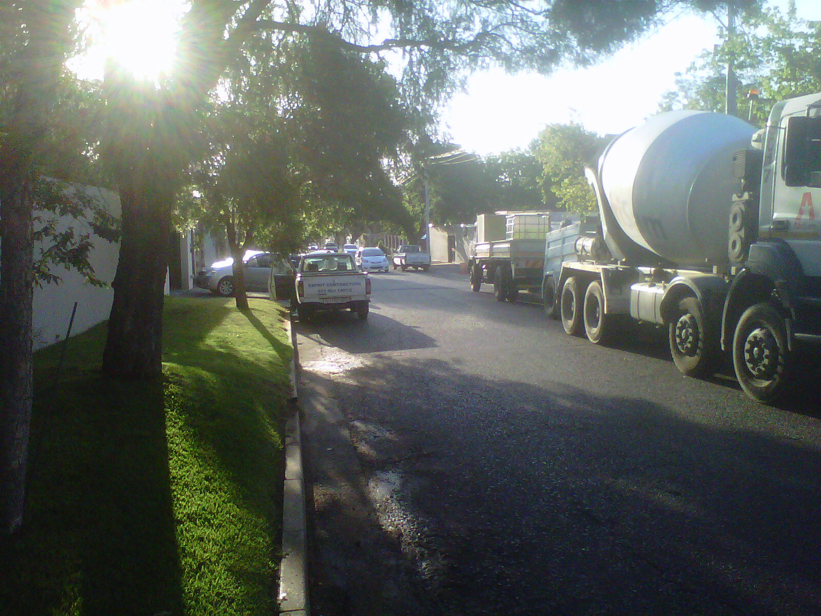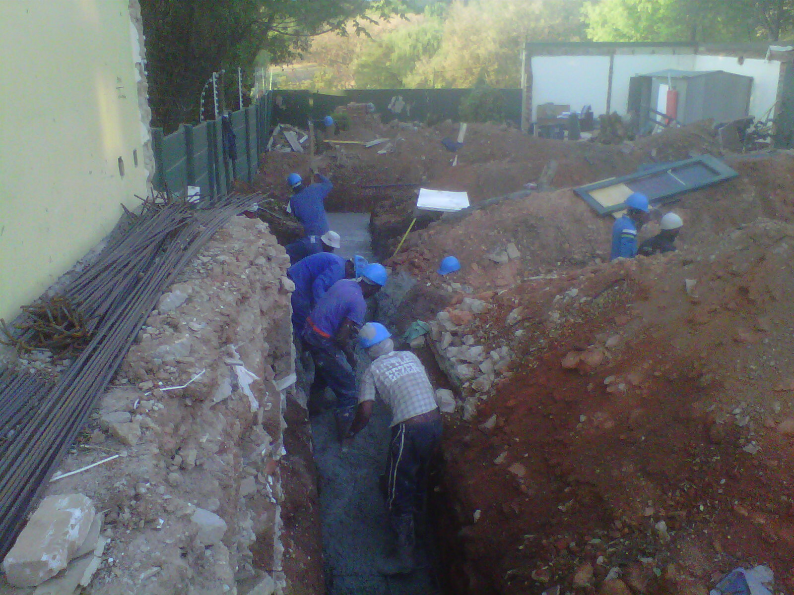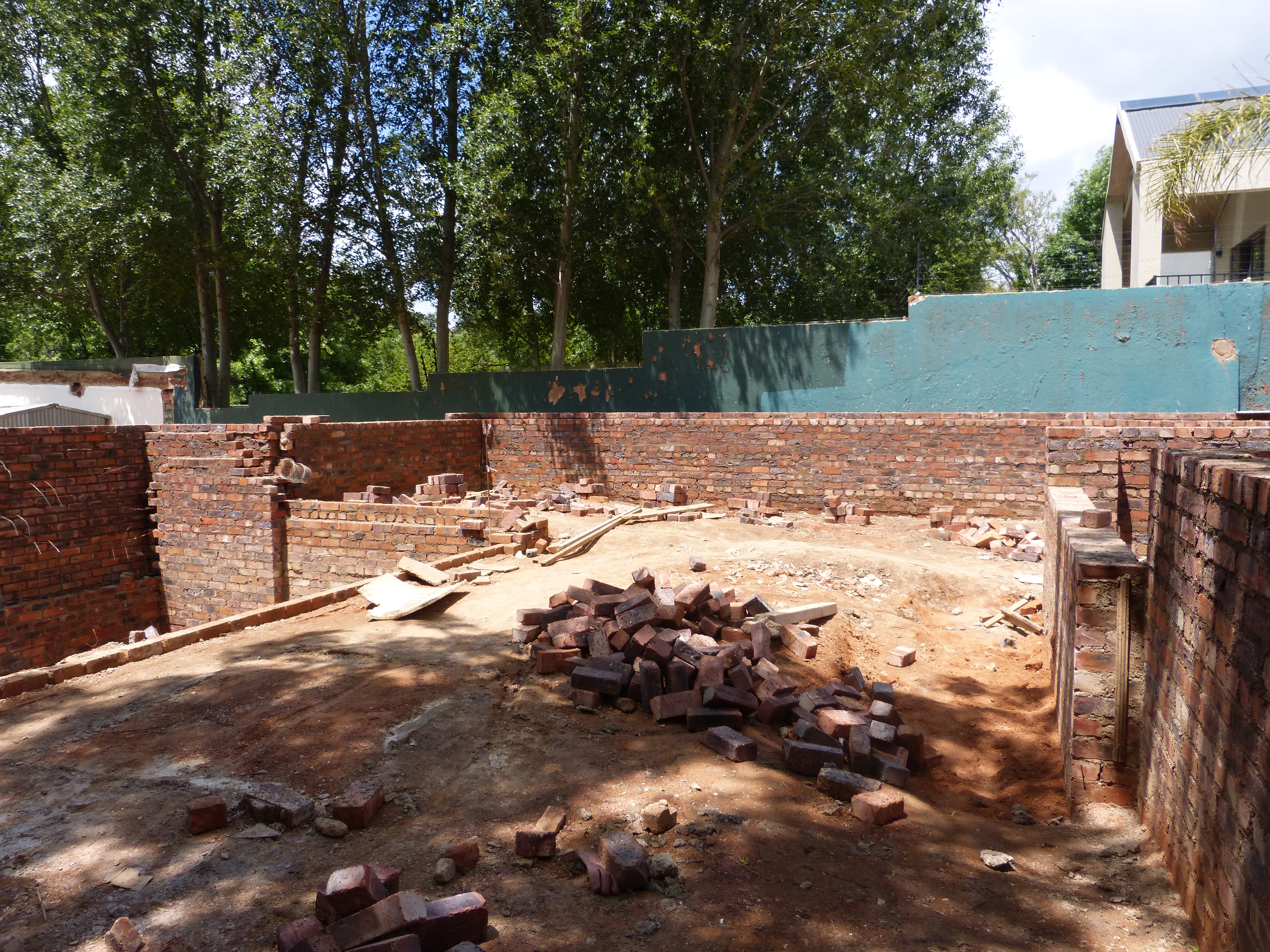 Up until now, we’ve been aiming to position our house as close to the level of the park as possible. We were hoping to have only one shallow step from the patio down onto the lawn, and from the driveway and front porch, only a very shallow step up into the entrance hall. Tracing the sewer proved problematic. The council couldn’t help. Days and days of digging by the builders, however, have eventually revealed the sewer to be – although buried far down – at a higher point than our downstairs toilet was going to be. So, at this morning’s site meeting we had to take a decision to raise the entire ground floor level of the house by two brick courses and that may still change to three. Of everyone involved in the planning, I seem to be the one least troubled by this: Knowing how the rain thunders down in Johannesburg, I was always a little concerned that we might have flooding under the front door occasionally unless the driveway drainage is absolutely and completely faultless. Also, in our present home, our patio is completely level with the lawn and many storms have left the tiles awash with water, despite our having built a special drain to avoid this. So a few steps here and there, provided they’re wide, shallow and outside, are fine with me.