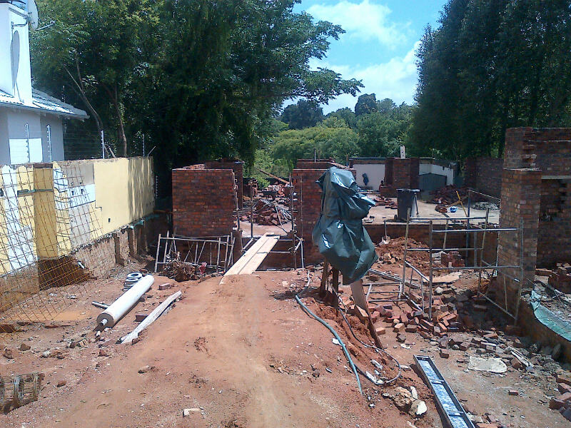 View of the back garden with guest ‘rondavel’ on higher terrace. Rockery built from on site quarry stones.