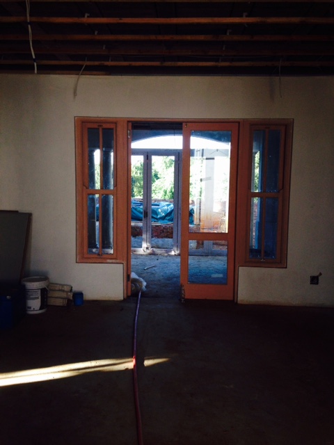 It was good to be able, finally, to get a sense of this space, looking from the living room, south through the library.  For over a year, this double door space has been boarded up and the library space has been used as a site office. Eventually there will be sliding doors in this space.  Again, while all the doors in the main house have been delivered and installed, we are still waiting for these.  Sliding doors seem to equal delays for some unknown reason.