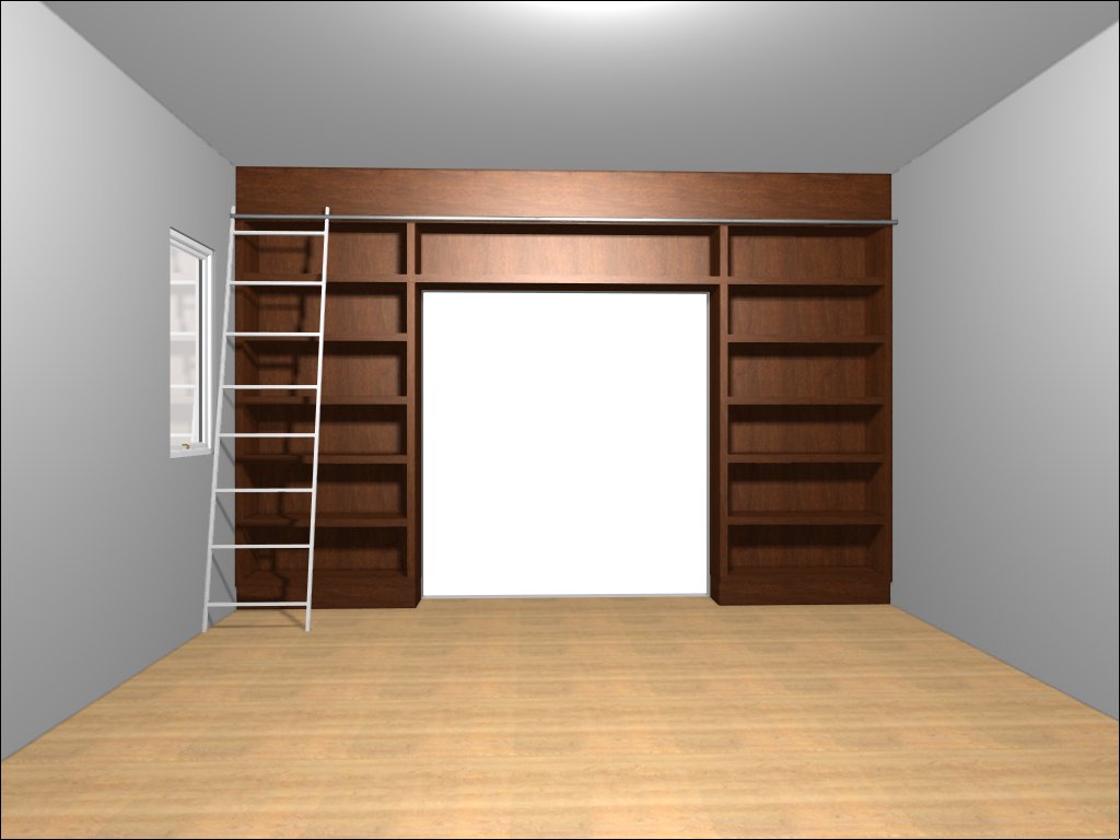 Shelves (white) will surround the sliding doors between the library and living room areas.