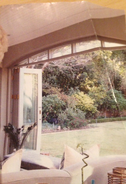 Taken from library sliding door opening, looking north, through living area and patio to garden.
