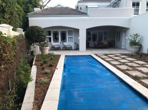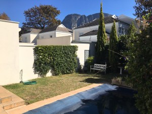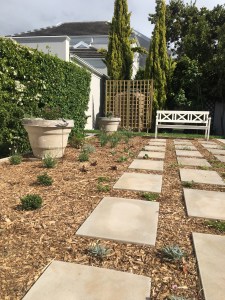 With the ongoing drought in the Cape and severe water restrictions, we decided to install two water tanks and to plant a water-wise garden as far as possible.  I have a great friend in Cape Town, Liz King, who wrought miracles with her garden when she got rid of a flat, thirsty lawn and transformed it into an interesting, breathtaking space using pavers and ground covers.   She and her garden have been my inspiration for the changes I’ve made to my very compact space and she’s given me help and advice along the way.  Below is a photograph of her beautiful Rondebosch garden.