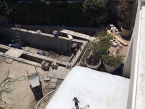 In the pictures below, you can see the ‘trenches’ left around three sides of the garden.  This was done for the survival of the established climbers, shrubs and trees planted against the walls.