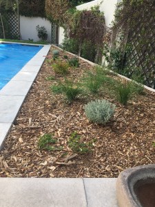 In January, Sean Newberry of New Space Landscaping, brought in his team and made a start with the planting of indigenous, hardy ground cover and shrubs, before spreading a thick layer of mulch over the surface.  Sean also connected our disused sprinkler system to the two new water tanks, making it possible to water the garden using stored rain water only. He erected the screen in front of the visible water tank and we hope it will soon be covered in creeper.