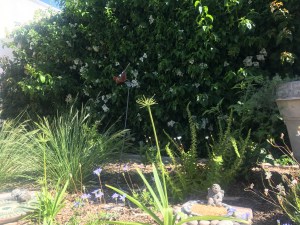 As far as possible, I’ve chosen indigenous plants in Cape Town in the hope that they will survive heat and drought.  This is a new direction for me, having always leaned towards English gardens.  In its original guise, this garden had little or no birdlife.  In  just four months it’s been gratifying to welcome quite a variety of birds into this compact area.  Instead of only a few doves, we are now visited by Cape Robins, Thrush, Sunbirds and Bulbuls.  I hope that as the garden becomes more established, there’ll be even more.